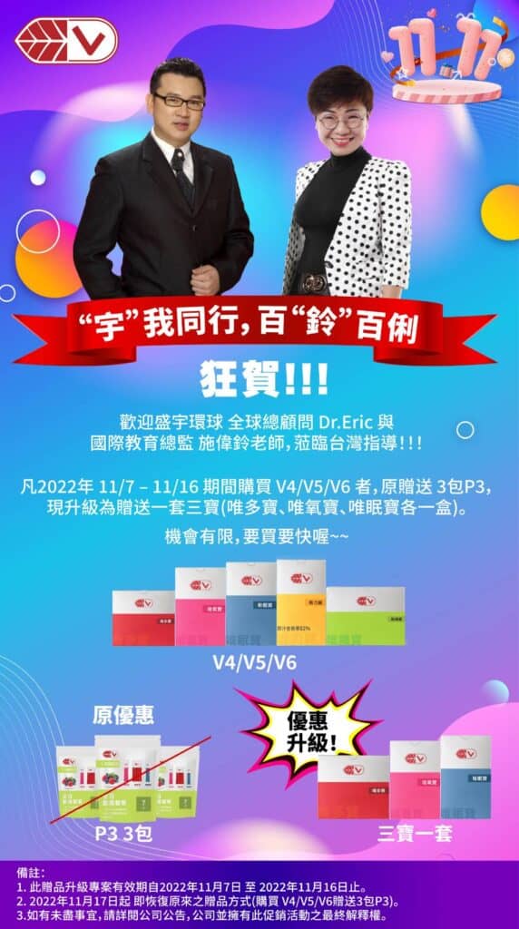 凡2022年 11/7 – 11/16 期間購買 V4/V5/V6 者,原贈送 3包P3,現升級為贈送一套三寶(唯多寶、唯氧寶、唯眠寶各一盒)。