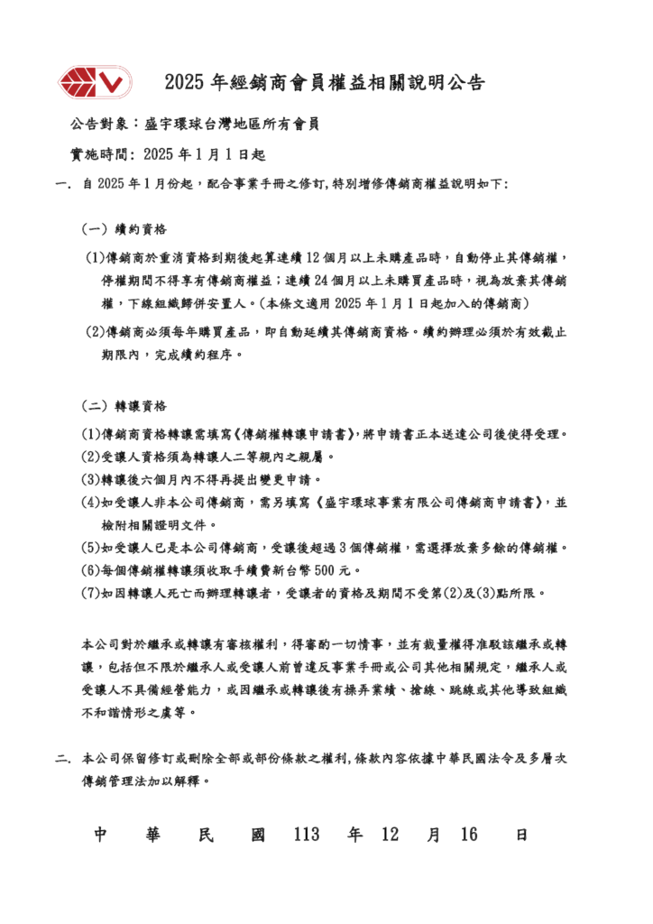 2025年 盛宇環球會員權益修定公告 / 重要公告 / 作者: 盛宇環球事業 Spread the love 2025年 盛宇環球會員權益修定公告 2024-12-18 13:46 2025年 盛宇環球會員權益修定公告