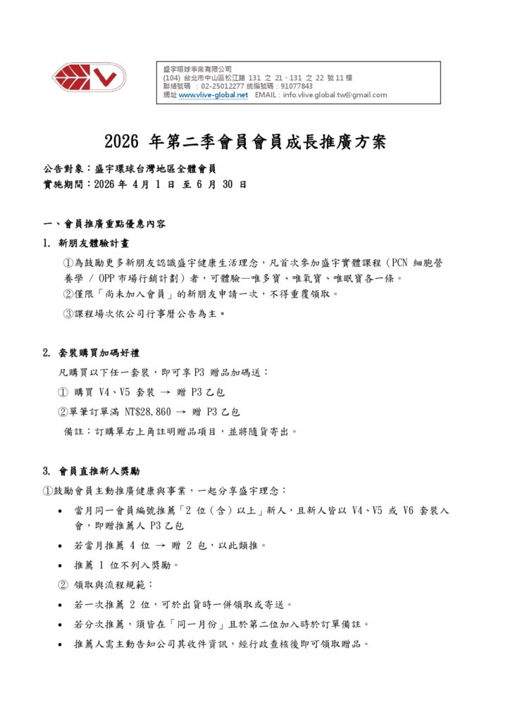2026 年第二季會員會員成長推廣方案 / 商品優惠 / 作者: 盛宇環球事業 Spread the love 2026 年第二季會員會員成長推廣方案 2026-04-01 06:00 2026 年第二季會員會員成長推廣方案